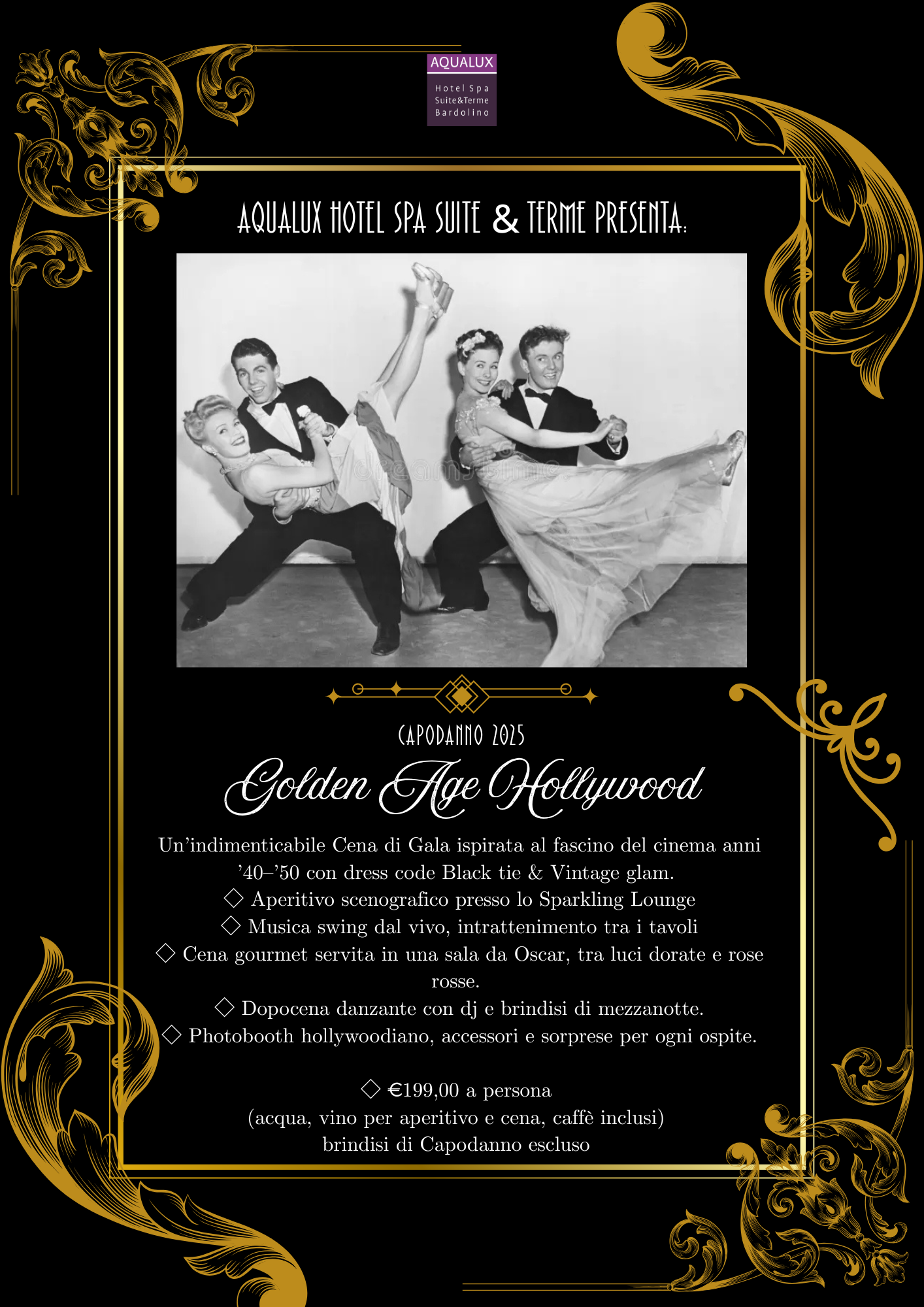 Let yourself be transported to the magic of classic cinema from the 1940s and 1950s: a glittering, refined, and glamorous atmosphere, where black, white, gold, and red take center stage in an unforgettable night.